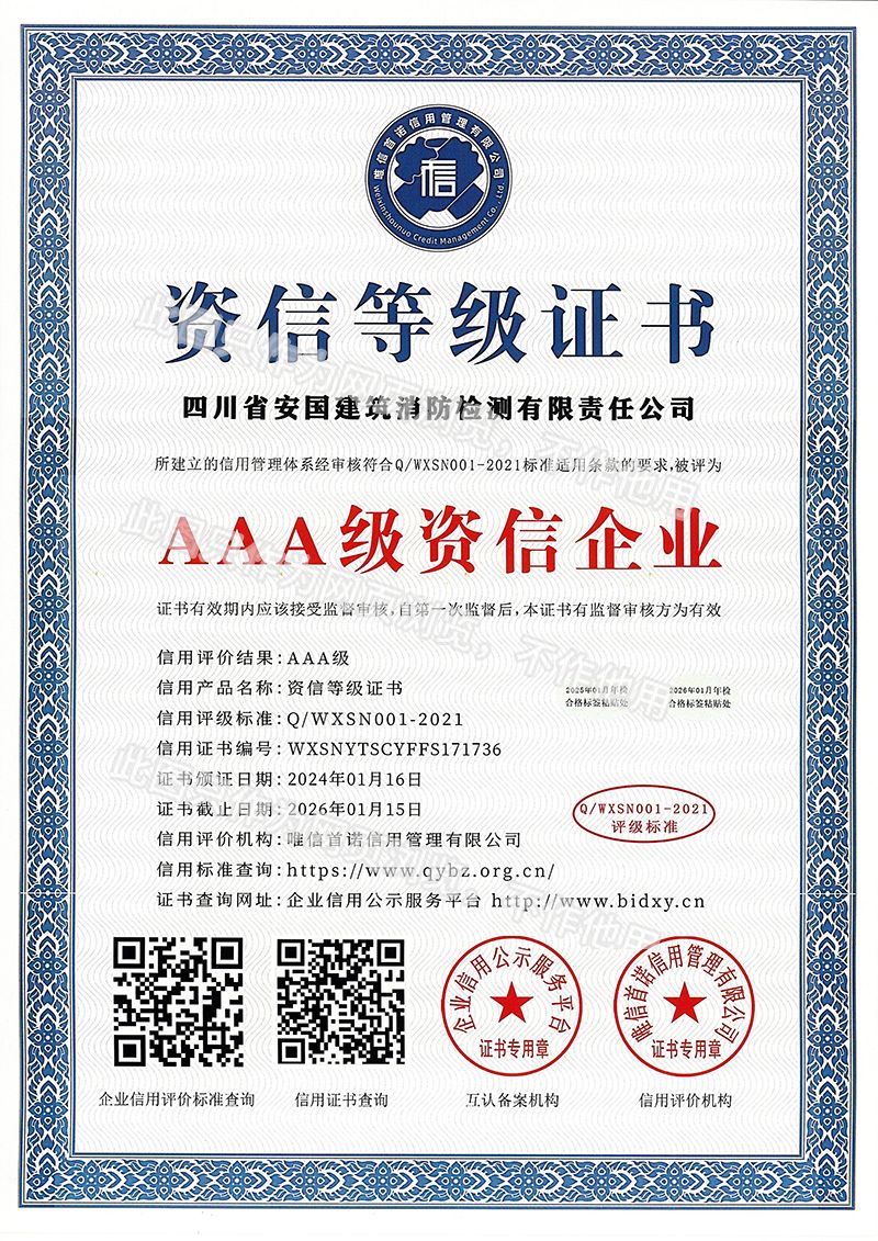 四川省安國(guó)建筑消防檢測(cè)有限責(zé)任公司,成立于1998年,經(jīng)四川省公安消防總隊(duì)批準(zhǔn),工商部門注冊(cè)的獨(dú)立法人單位。 公司具有建筑消防設(shè)施檢測(cè)、電氣防火安全檢測(cè)、維修、保養(yǎng)及技術(shù)咨詢一級(jí)資質(zhì)的中介技術(shù)服務(wù)機(jī)構(gòu),獲得CMA計(jì)量認(rèn)證。主要業(yè)務(wù)范圍是:接受建設(shè)單位或有關(guān)單位委托,承擔(dān)新建、改建、擴(kuò)建建筑自動(dòng)消防設(shè)施技術(shù)檢測(cè)、電氣防火安全檢測(cè)、以及承接建筑消防設(shè)施維護(hù)保養(yǎng),對(duì)已交付使用的建設(shè)消防設(shè)施的運(yùn)行情況進(jìn)行運(yùn)行檢測(cè),開展建筑消防設(shè)施的消防安全技術(shù)咨詢。公司設(shè)辦公室、總工辦、財(cái)務(wù)部、檢測(cè)部、維保部等職能機(jī)構(gòu),擁有一